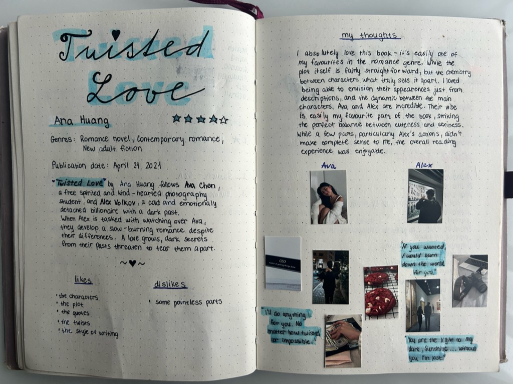A book review provides a brief summary of the plot or main ideas, evaluates the book’s strengths and weaknesses, and offers an overall recommendation. It also helps preserve your memory of the book, making it easier to recall later. Start with the basics: title, author, genre, and publication date. Summarise the key ideas or plot, and reflect on your reactions—what resonated or stood out to you? Include memorable quotes that impacted you. Finally, create a vision board with images or phrases that represent the book’s themes or emotions to enhance your reflection and add a creative, personal touch to your journal.