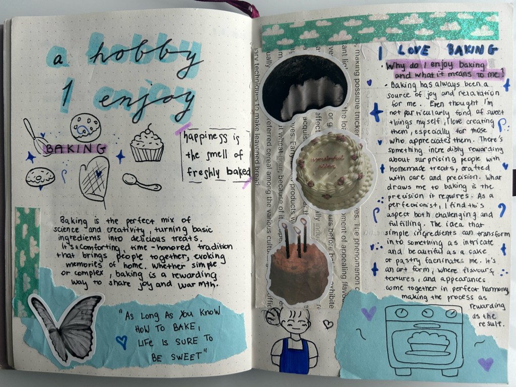 Writing about your favorite hobby boosts creativity, deepens your knowledge, reduces stress, increases motivation. When writing about your hobby, start by defining what it is and explaining why you love it. Describe the aspects that make it enjoyable and fulfilling. Then, enhance your journal page with pictures related to the hobby and use colors that reflect its essence. This combination of description and visual elements will create a vibrant and engaging representation of your passion.