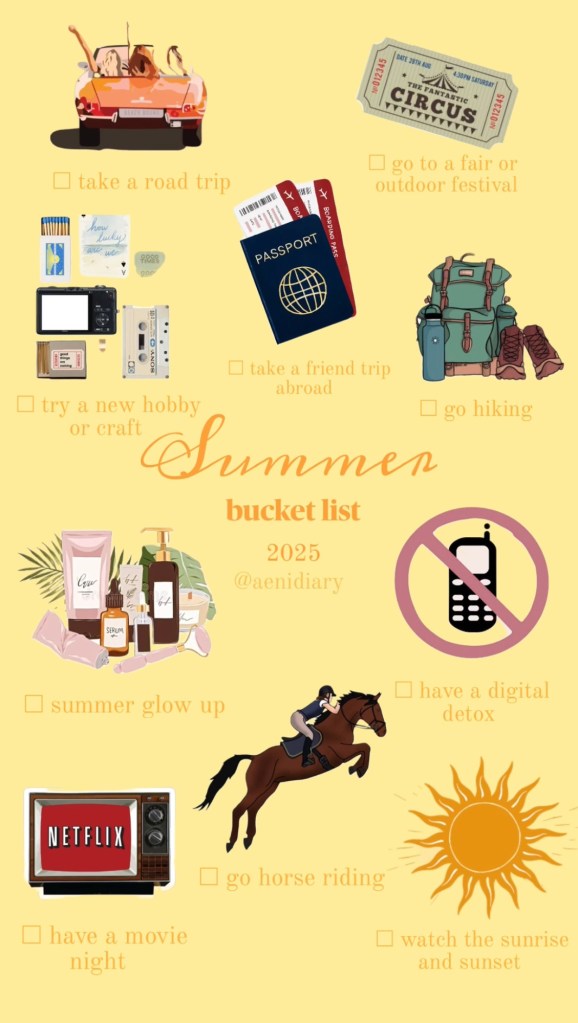 I know I’m a bit late with this year’s summer bucket list, I’ve been busy getting my life together these past few months, and honestly, I just didn’t have much time to write. But hey, it’s still not too late to make this summer count! These are the things I want to explore before the season ends, and I truly hope you’ll dive into them with me. The sun is shining — just like you, my little Sunshines — and this list is packed with adventure, creativity, and a touch of uniqueness. Let’s make the most of it together! ☀️✨